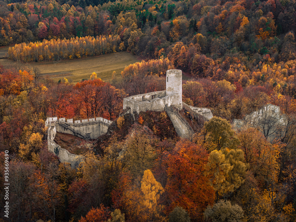 Obraz Zamek Pilcza, położony na wzgórzu w Smoleniu na Jurze Krakowsko-Częstochowskiej, to średniowieczna warownia należąca do systemu tzw. Orlich Gniazd #935669690