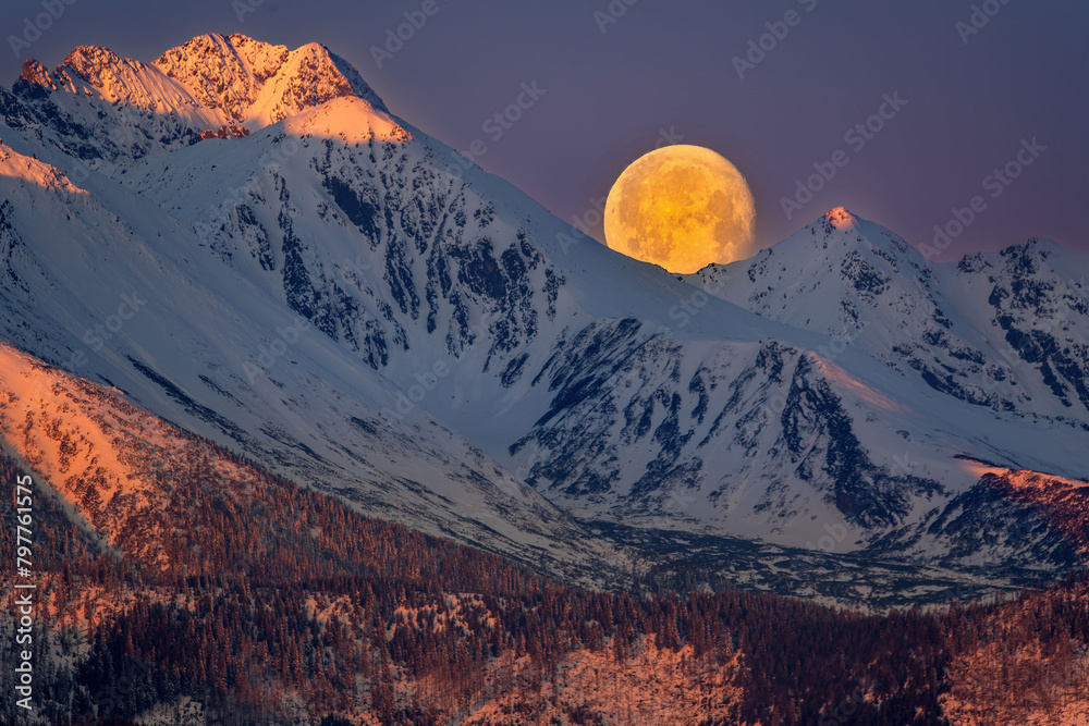 Obraz Ogromny księżyc w pełni zachodzi za Tatrami o poranku #797761575