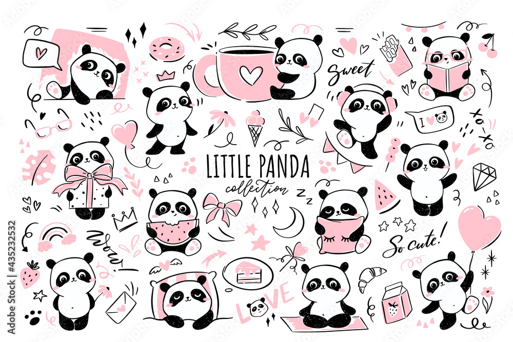 Plakat Mała panda - duża kolekcja clipartów. Zestaw ilustracji z postacią słodkiej pandy wykonującej różne czynności - przytulanie filiżanki kawy, spanie, robienie jogi, latanie balonem, jedzenie arbuza. #435232532