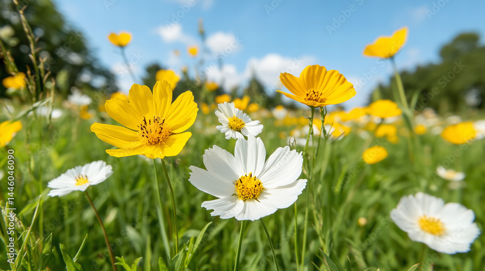 Plakat Zbliżenie żółtych i białych kwiatów na zielonej łące na tle jasnoniebieskiego nieba z białymi chmurami #1446046090