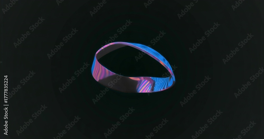Fototapeta Pływająca, abstrakcyjna wstęga Mobiusa w czarnej pustce z odblaskowymi neonowymi paskami #1777835224