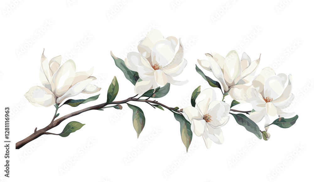 >Naklejka>Tematy>Kwiaty>Magnolie>Ilustracja wektorowa gałęzi drzewa magnolii z kremowo-białymi kwiatami, zielonymi liśćmi, w stylu akwarelowym, wiosennym wzorem, eleganckim elementem kwiatowym, szablonem zaproszenia, odizolowaną grafiką botaniczną