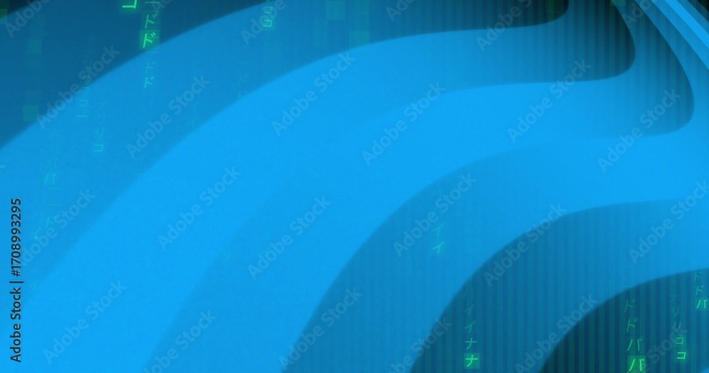 Plakat Płynne centralne niebieskie kształty fal w środowisku interfejsu cyfrowego z pionowymi zielonymi symbolami kodowymi #1708993295