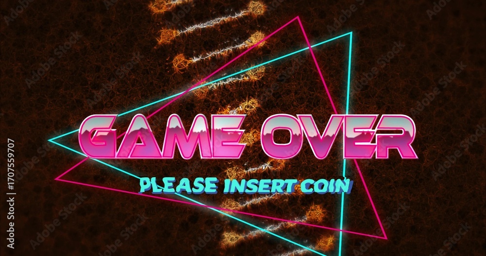 Plakat Wyświetlanie neonowego tekstu GAME OVER i PROSZĘ WRZUCIĆ MONETĘ na ekranie gry zręcznościowej ze świecącą geometrią #1707559707