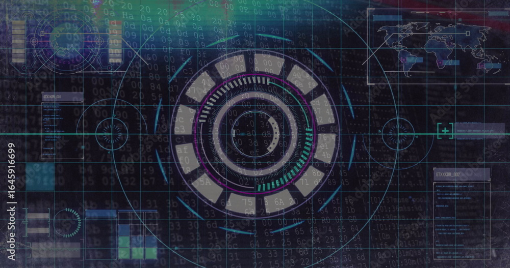 Plakat Prezentacja okrągłego HUD w cyberprzestrzeni z nakładką kodu binarnego, siatkami, celownikami, panelami i mapą świata #1645916699
