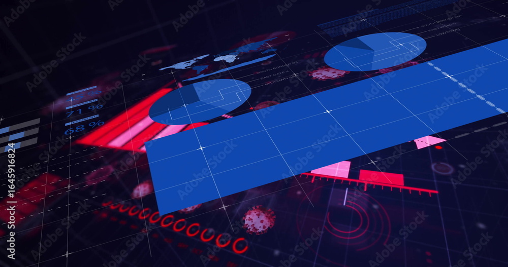 Plakat Wyświetlanie widoku danych na panelu cyfrowym, zawierającym wykres słupkowy, mapę świata i ikony wirusów #1645916824